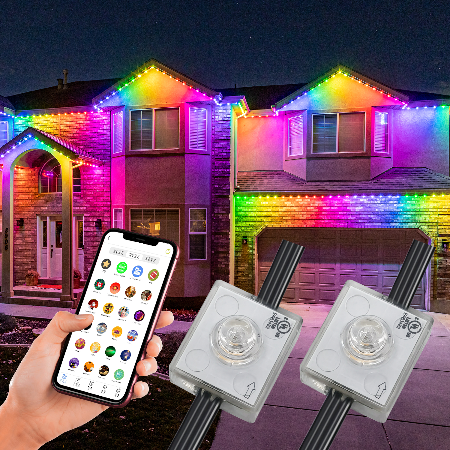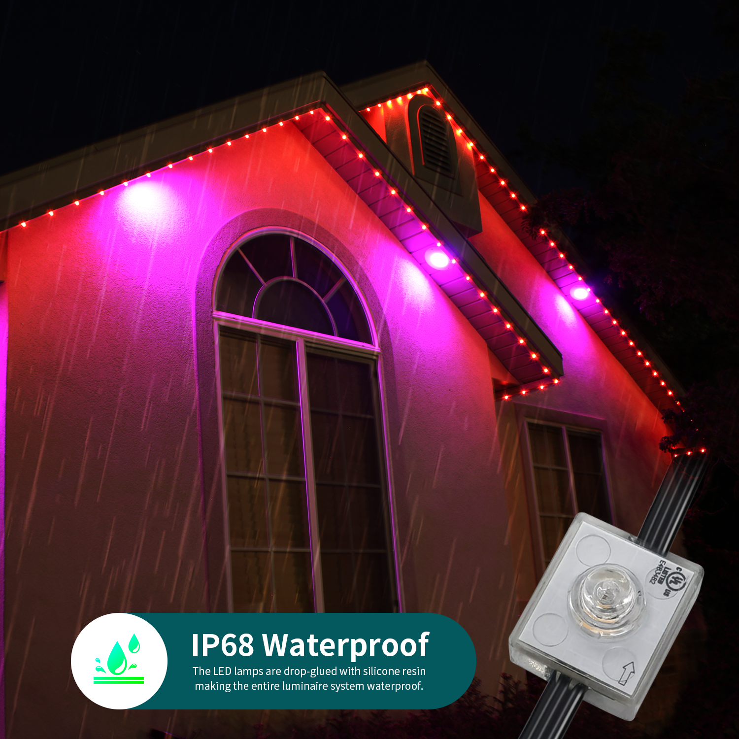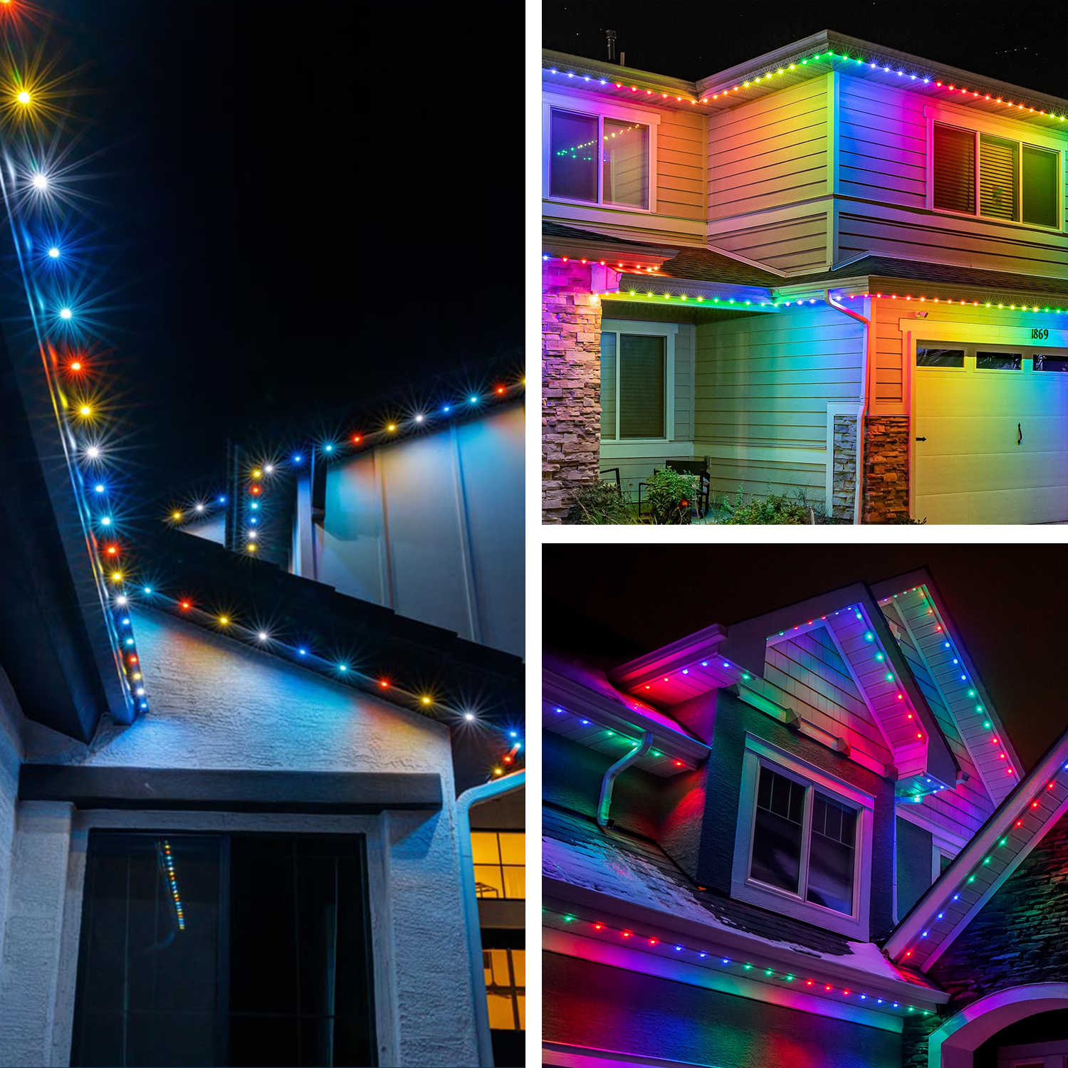 Designed and Installed by a certified electrician's supervision. LED lighting system for long-term use. An easy-to-use companion app that is cloud based, providing you access to your lighting system from anywhere in the world. Pre-programmed effects as well as a comprehensive editor that allows users to create their custom sequences. With an IP (Ingress Protection) rating of IP68 and a sturdy aluminum outer channel, the permanent holiday lighting is dust-tight and completely waterproof, ensuring it stands up to even the harshest North American winters. With our permanent holiday lighting system you get twice as many pixel LED lights to stand out for the best visual effects.